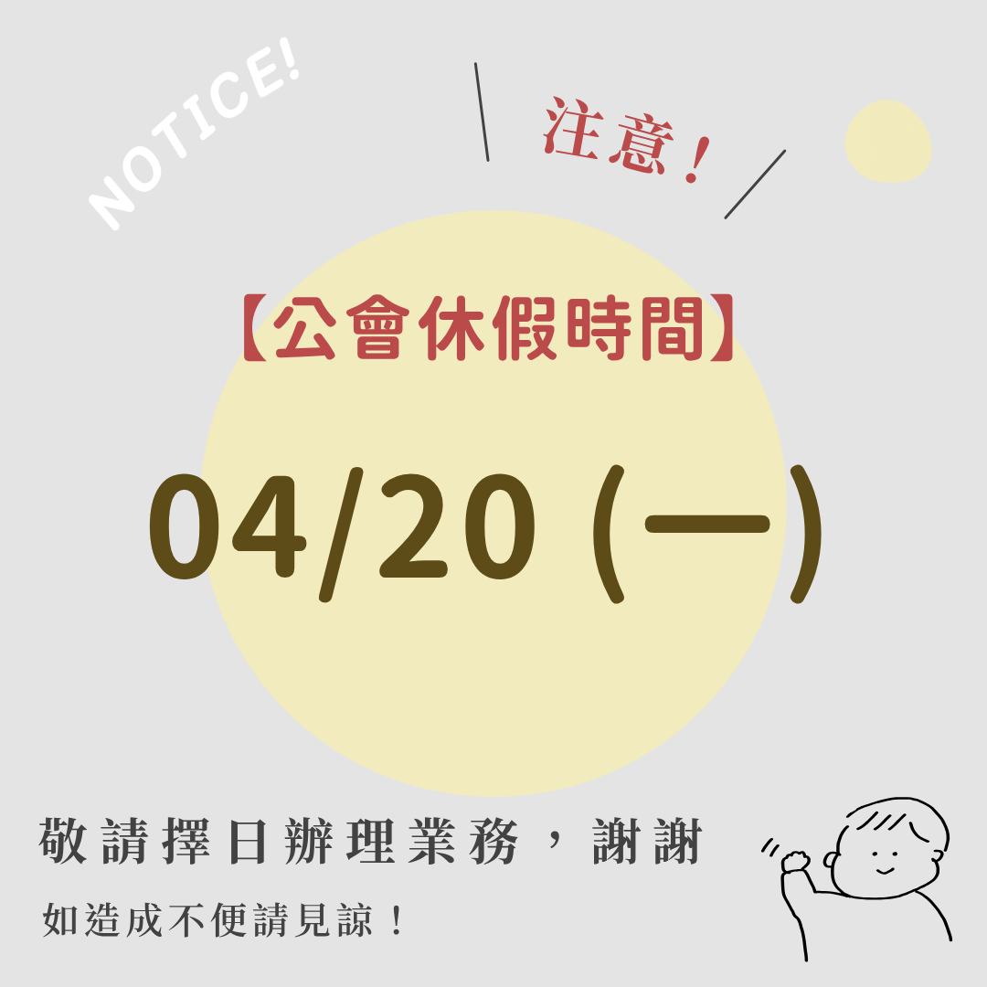 【公會04/20(一)休假,暫停辦理業務】如需辦理業務敬待上班日辦理,謝謝!