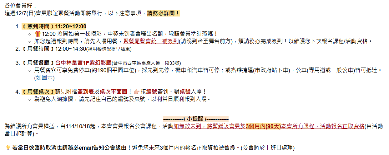 目前聚餐名額已額滿,再次提醒,若已超過取消報名的截止期限,活動前幾日欲臨時取消也請務必告知公會!避免您未來3個月內的活動/課程報名資格被暫緩。