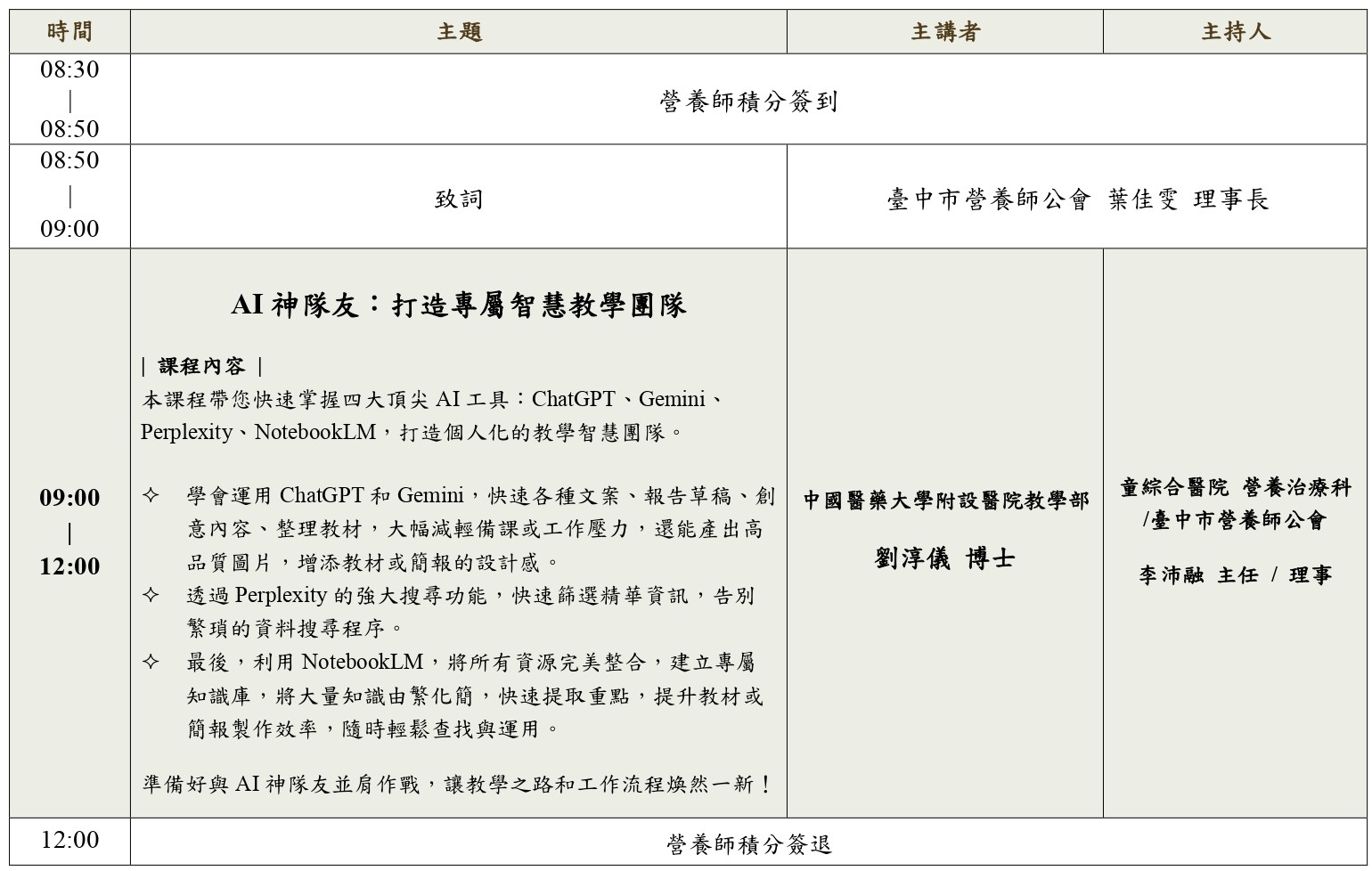 參與人員:僅限臺中市營養師公會會員參加(免費),名額限60位。